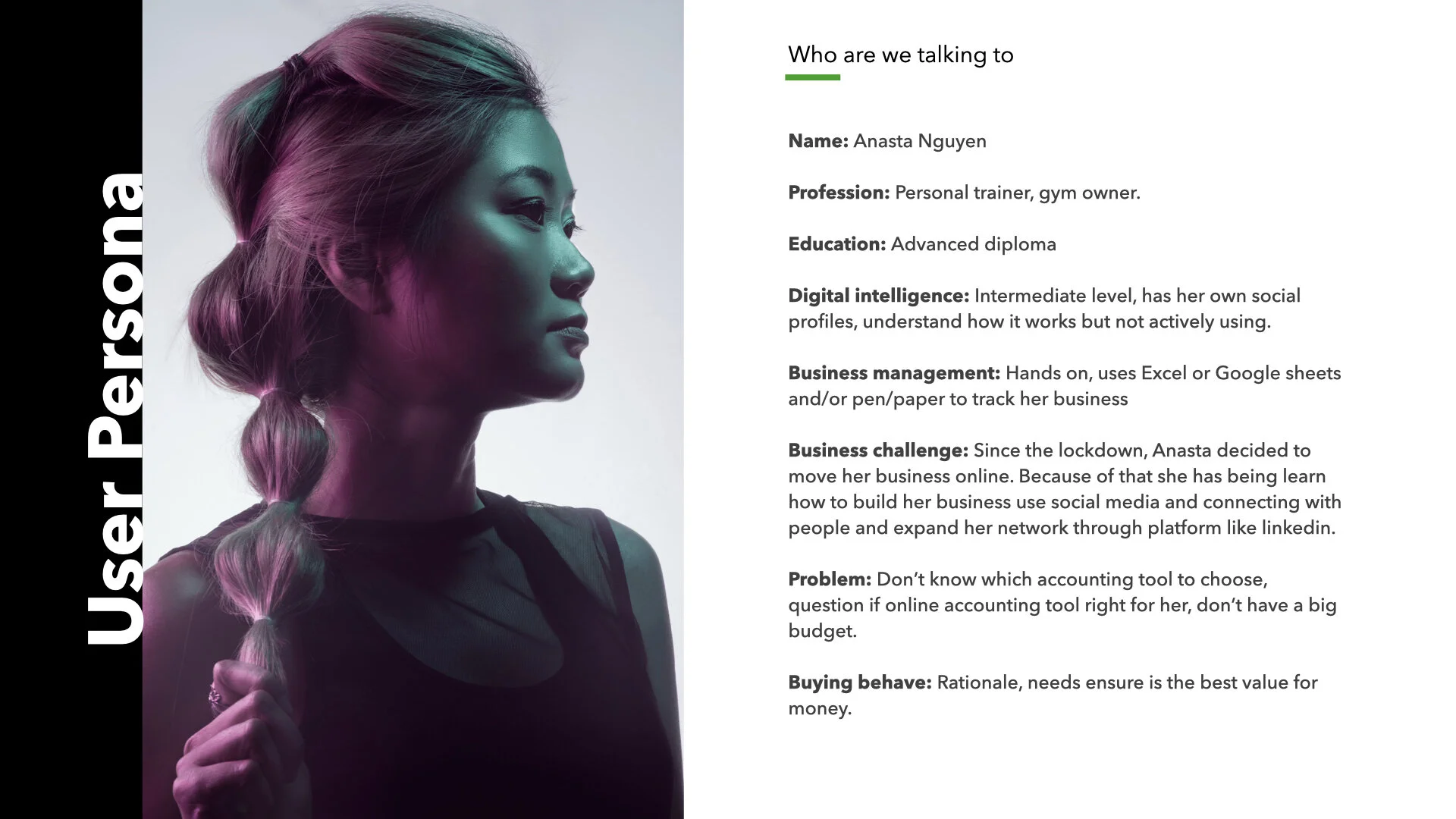 Target Audience: Anasta has a service-based business and she uses Excel or Google sheets and/or pen/paper to track income and expenses. She is in the market looking for a new way to run her business in a more efficient way.