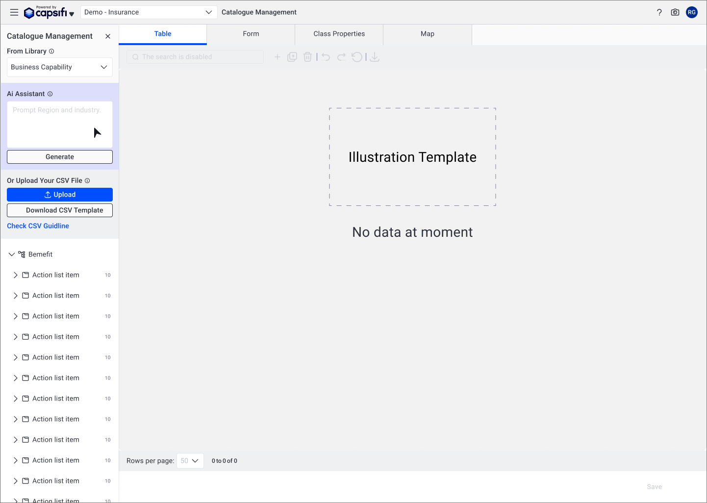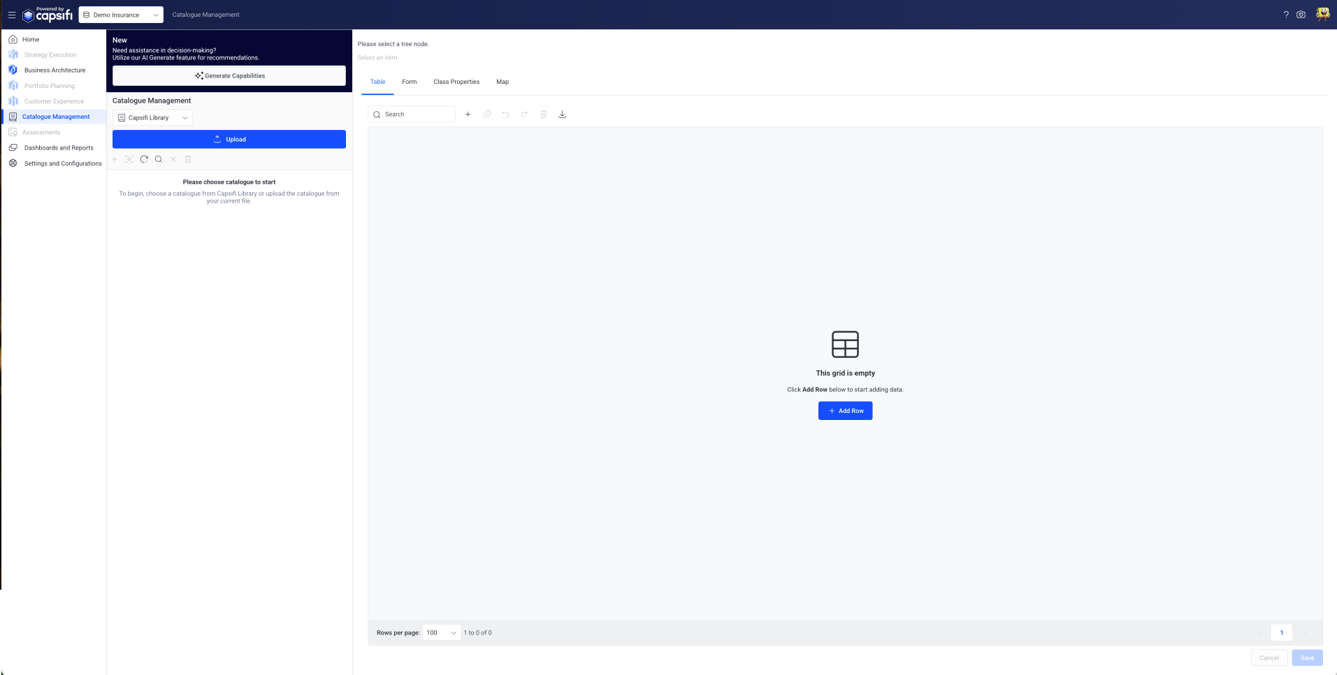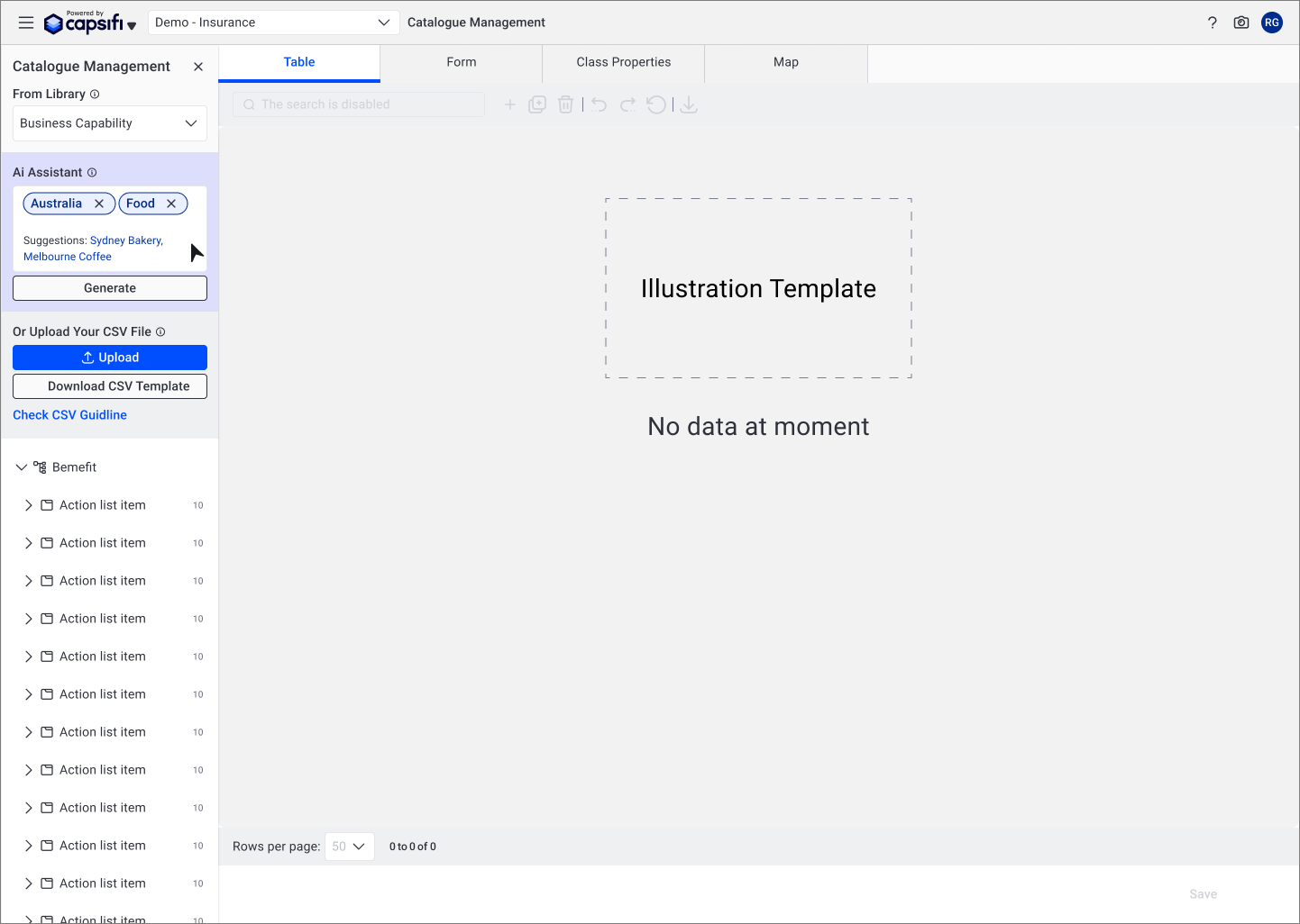 Capsifi's file upload feature enables users to either upload their own Excel data or utilise pre-built templates from the Capsifi library. This functionality is central to activating Capsifi's AI-powered suggestions, which only work when users upload business capability data.